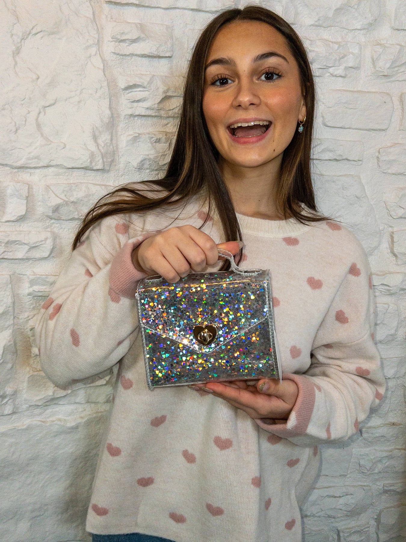 Our latest version of Gussie may be our very favorite yet! She is filled with silver hearts that reflect the beauty of all colors when hit with light! Hopefully, she will become a classic and available year-round, but for now, she's a limited edition release. In the South, getting Gussied Up means you are gorgeous and extra fancy. When your sister has the same nickname, she gets her own handbag... filled with sparkles and joy and all the best things. She also comes with a matching cross-body strap and yes, the strap is filled with sparkle too! Lightweight, durable, clean with a wet cloth. 6.5” x 6.5” x 2”