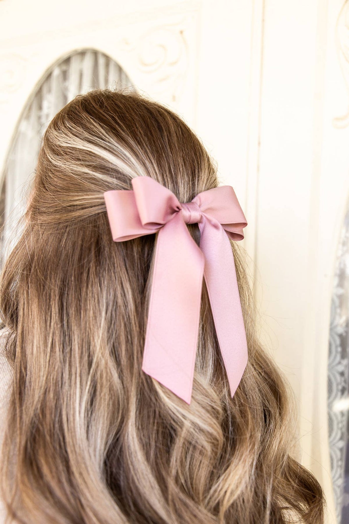 Grace and Grandeur Bow Company’s *NEW* silhouette, the Stella bow barrette in matte satin ribbon is perfect for medium to long hair lengths. Stella is a charming bow that pairs perfectly with tweed, pearls, and cap toe heels - she has us dreaming of coffee & shopping on the Upper East Side! Perfect year round for ladies or girls. Dimensions The Stella Bow measures approximately 5.5" wide and tails are approximated 7" long from top of bow to longest tip. This bow is secured on a 3" barrette. * Luxe Matte Satin Ribbon * Classic Bow * Barrette * Size |  5.5”W x 7”L * Grandmillennial Style * Measurements are approximate and may vary due to their handcrafted nature. ** Any props seen in photo are not available for sale. The Stella bow is sold individually regardless if it is shown in photos with multiple bows.