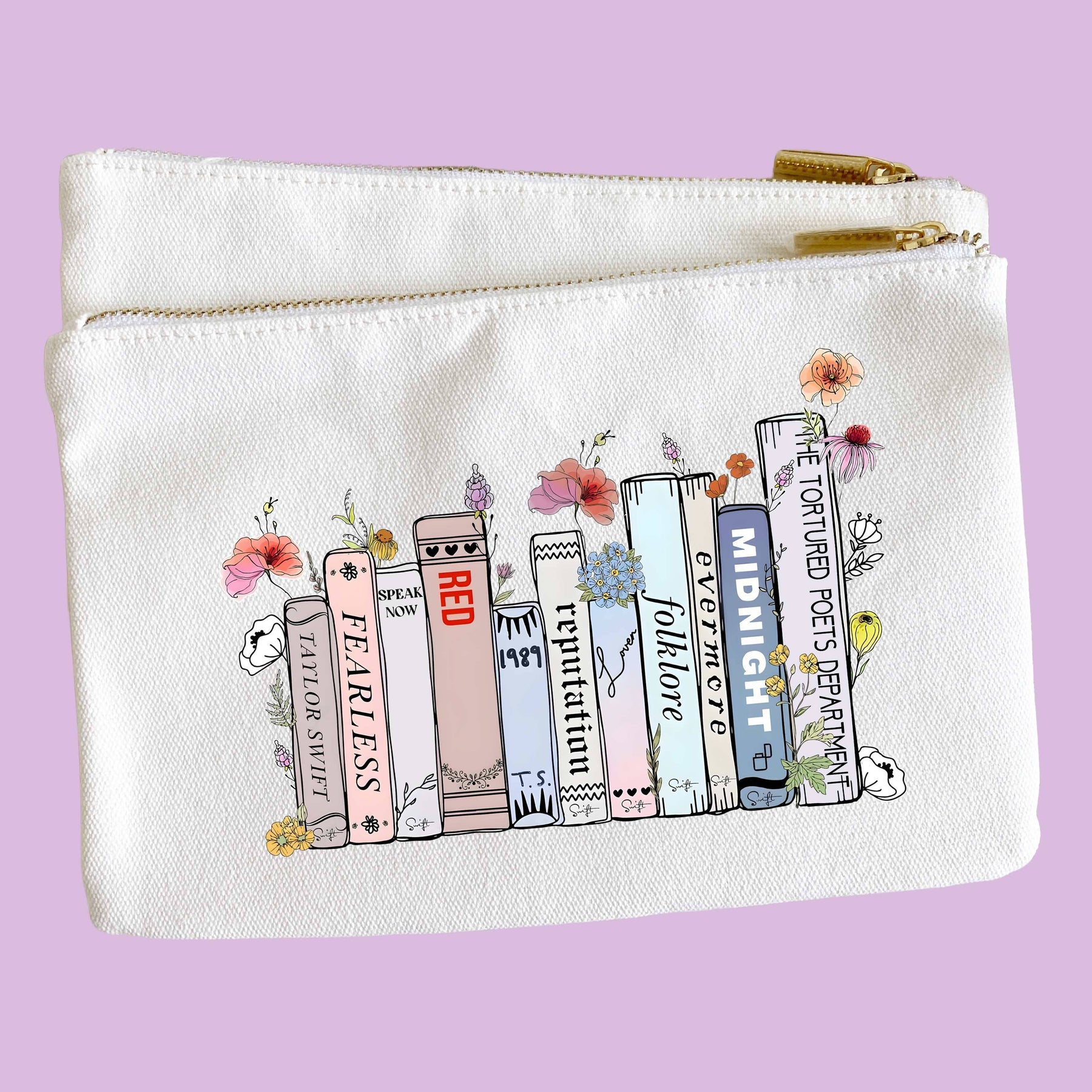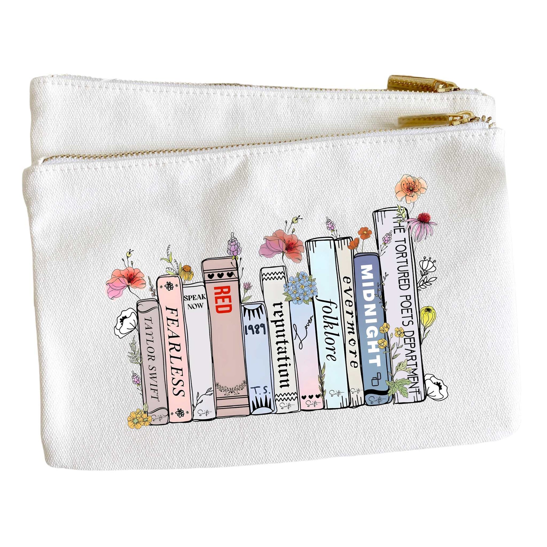 Swiftie gifts coontinue! 6x9 canvas gift pouch cosmetic bag perfect for Taylor Swift fans with the colorful swiftie album book artowrk imprint on the front.