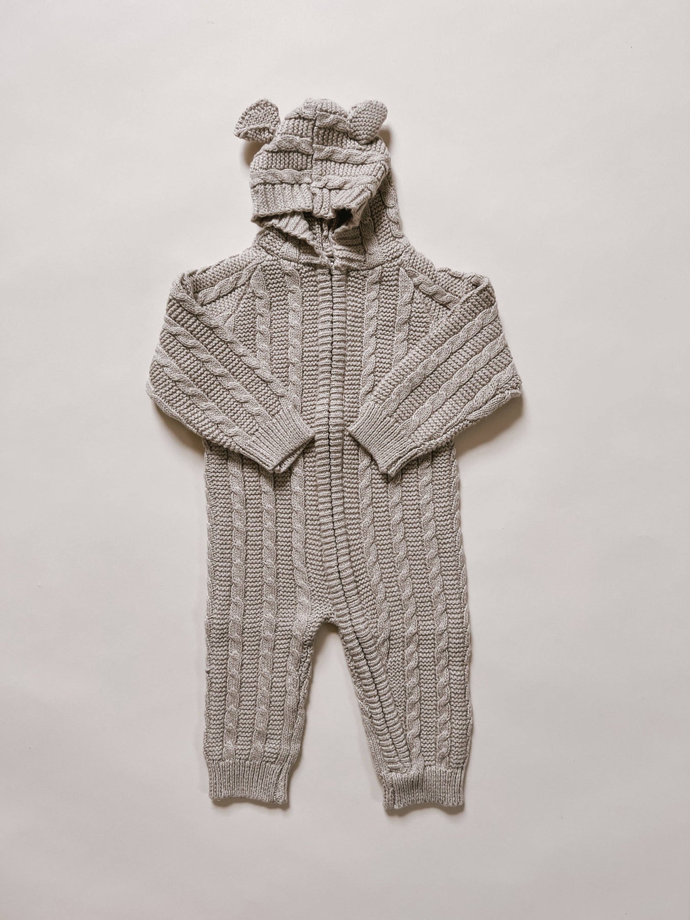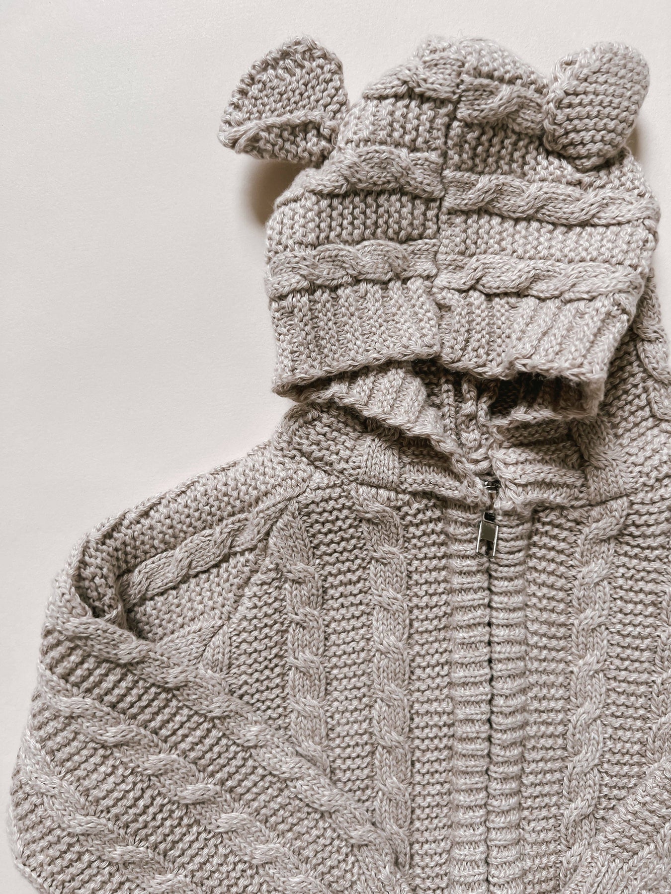Our Baby Bear Cable Knit Jumpsuit is the perfect blend of comfort and cuteness for your little one! Our cozy jumpsuit is thoughtfully designed to keep your baby warm and snug during chilly days and nights. Crafted with love and attention to detail, this jumpsuit features a classic cable knit pattern that adds a touch of timeless charm. The premium quality, soft 100% Organic yarn ensures gentle contact with your baby's delicate skin, making it ideal for cuddles and playtime. The front zipper closure makes dressing and undressing a breeze, saving you precious time while keeping your baby comfortable. * 100% Organic Cotton * Zipper at Center Front Care Instructions: Cold gentle wash with like colors. Lay flat to dry.