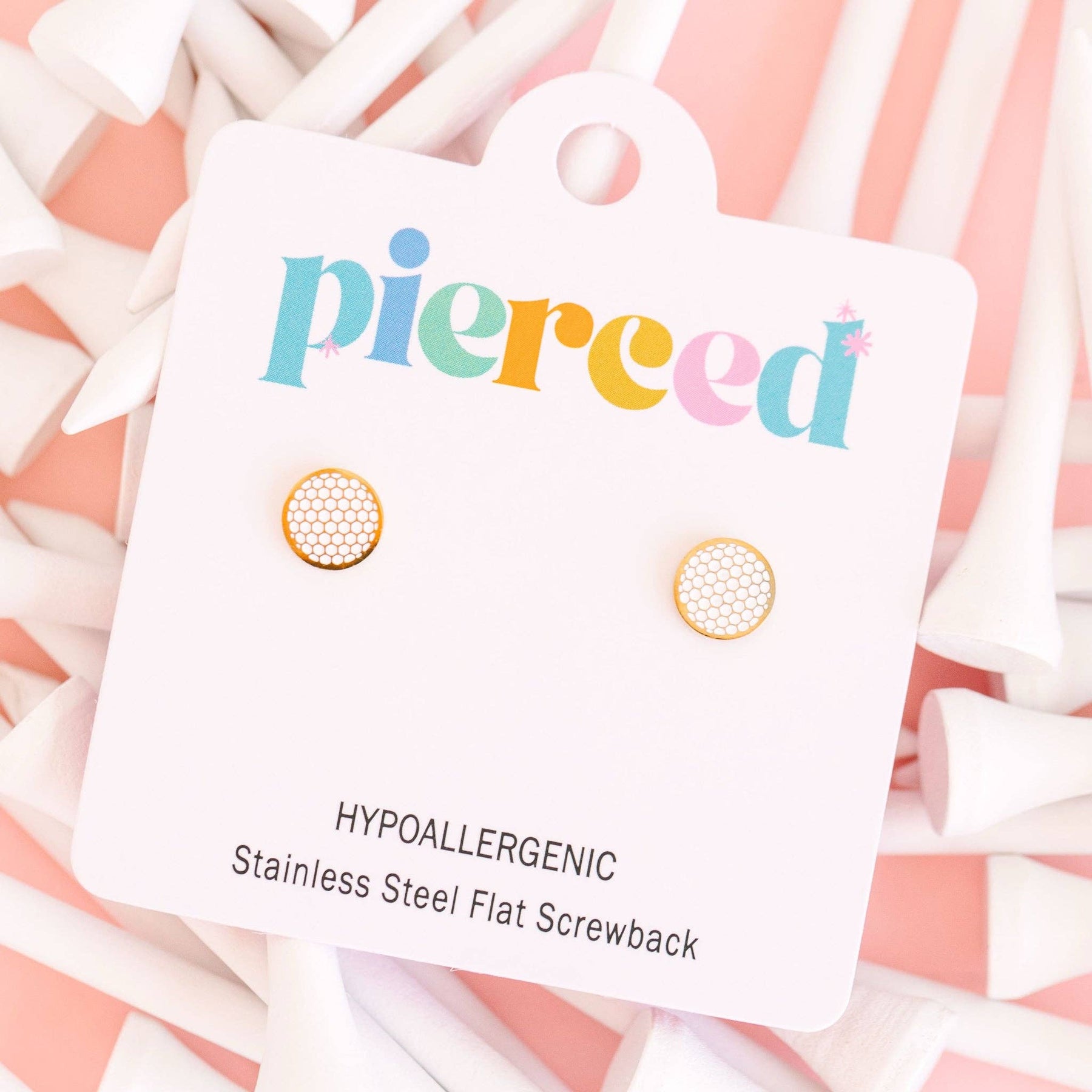 Materials * Surgical grade stainless steel * 18K gold plated * Lead & nickel free * Enamel * Always hypoallergenic Details * Flat flower screw-back * Ultra-thin post measuring .8mm (20 gauge)