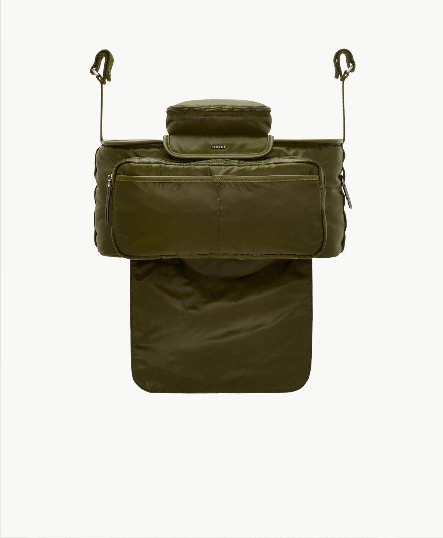 Crafted in a 100% recycled nylon exterior with a water-repellent andantimicrobial lining, this caddy is designed to carry it all—without compromising on style. It holds up to two drink cups, with a spacious main compartment for diapers, wipes, and creams. A roll-out pouch is always handy to store extra change of clothes, while built-in toy hooks keep little ones entertained. A slip pocket offers quick access to your phone, and a zippered pocket keeps essentials like keys and wallet secure.