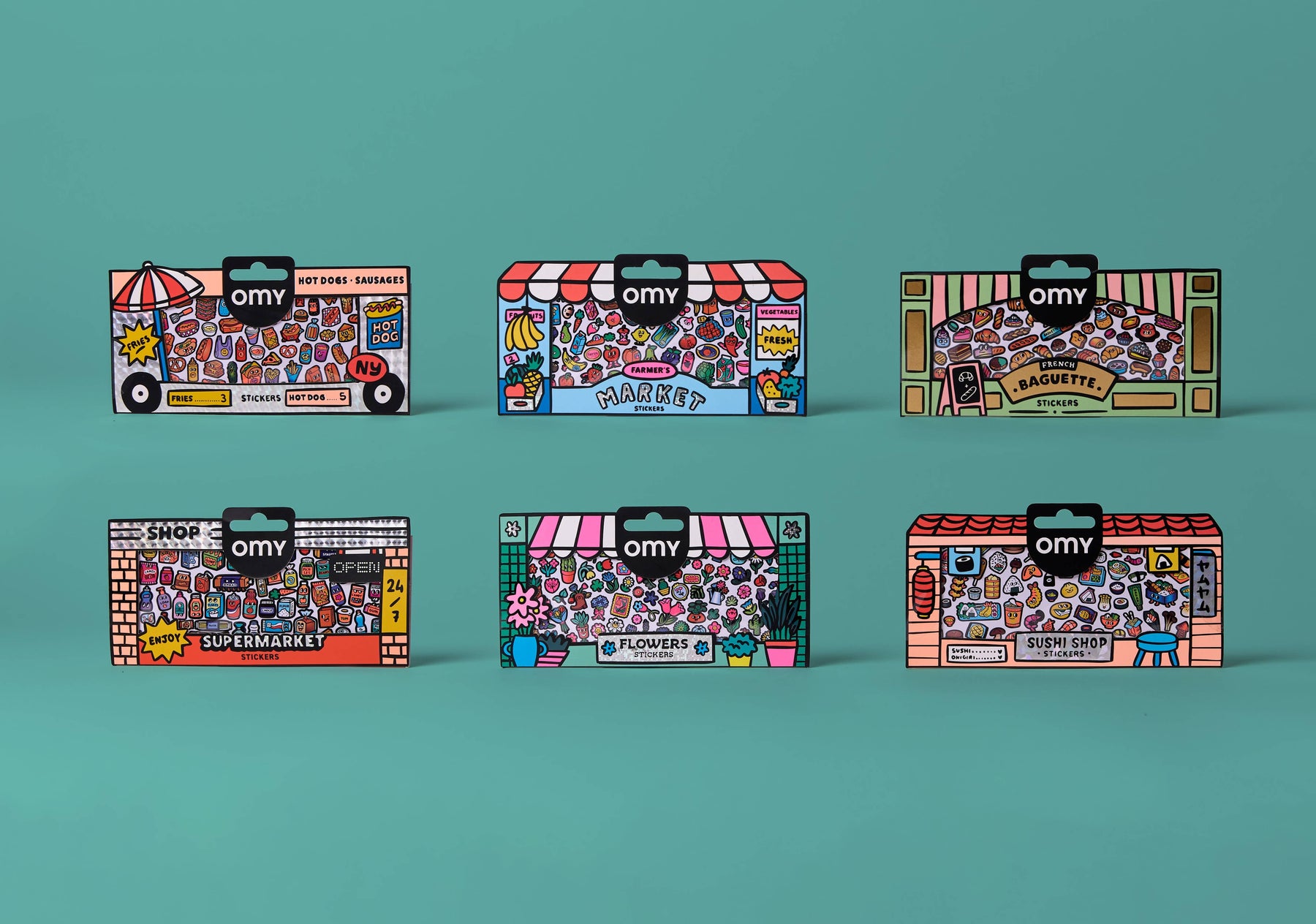 A fun and colorful assortment featuring the sticker sheets from the Fabulous Stickers collection, inspired by everyday shops and markets. Each sheet highlights a different theme — from Parisian cafés and sushi shops to bakeries and vibrant food stands.