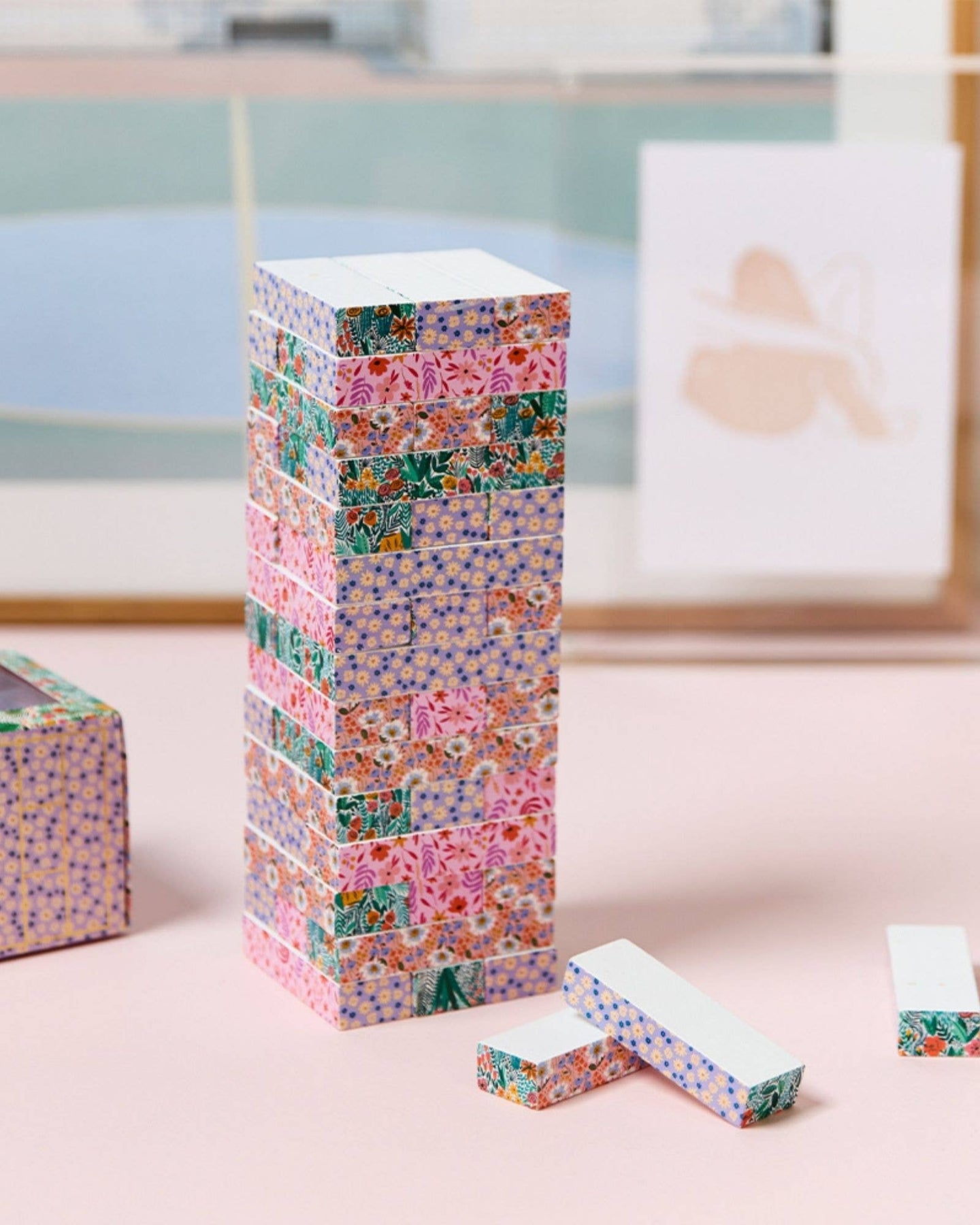 We have taken the tumbling tower game you all know and love and made it fabulous! Everything in life can be improved with floral prints. There's no need to pack your game away, it's too pretty for the cupboard. Includes: - 48 Wooden Tumbling Blocks How to Play: - Take Turns Removing one of 48 Blocks - Use one hand to remove a block from the tower - Stack It Without Tumbling! - Place the block on top without knocking it over - The Last Player Standing Wins! - Keep stacking until the tower collapses Why You’ll Love It: - Stylish Floral Design - A game that looks as good as it plays - Perfect for All Ages - Fun for kids, families, and friends - Compact and Display-Worthy - A chic addition to coffee tables or shelves - 48 High-Quality Wooden Blocks - Durable and smooth for satisfying gameplay