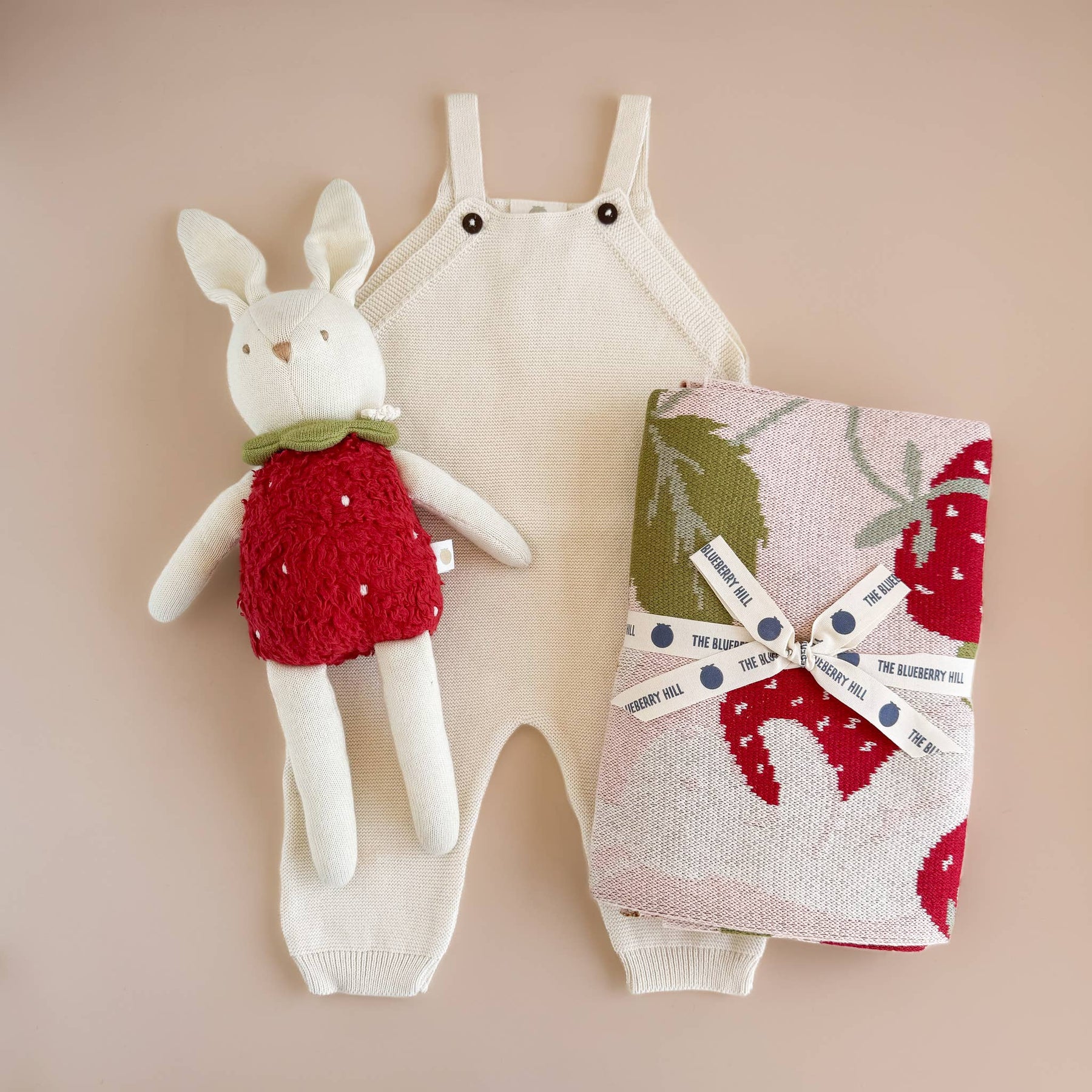 Bailey Bunny often visits the strawberry fields with her friends and enjoys meeting travelers passing by. She likes to hear their stories and help them learn about her community on Blueberry Hill. Gift together with the matching blanket, cardigan, hat or teether. Features: - Designed in Salt Lake City - Hand-crocheted flower detail - 14" tall - 100% Organic Cotton, exclusive of trim - Recycled Polyester Fill Care Instructions: Hand wash cold. Do not bleach. Do not wring. Dry flat in shade. Do not tumble dry. Warm iron.
