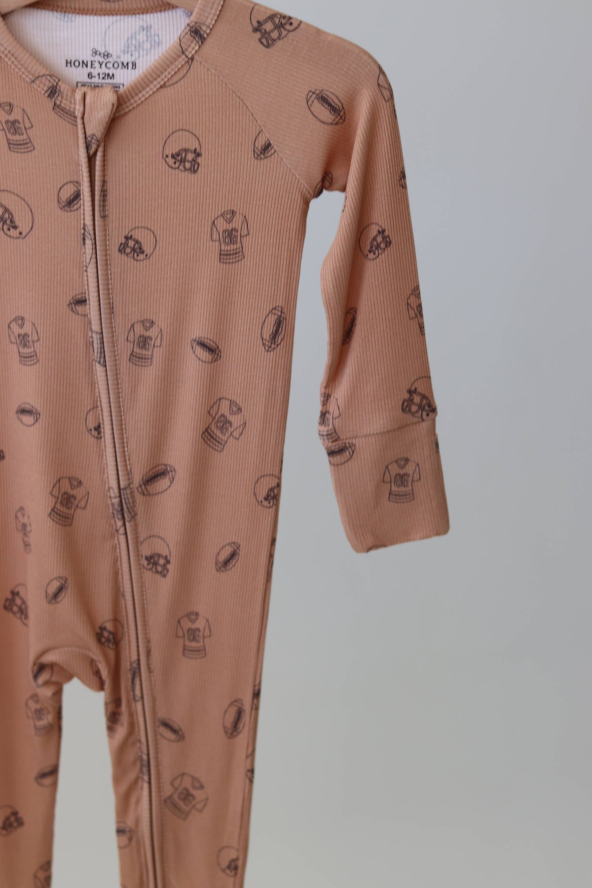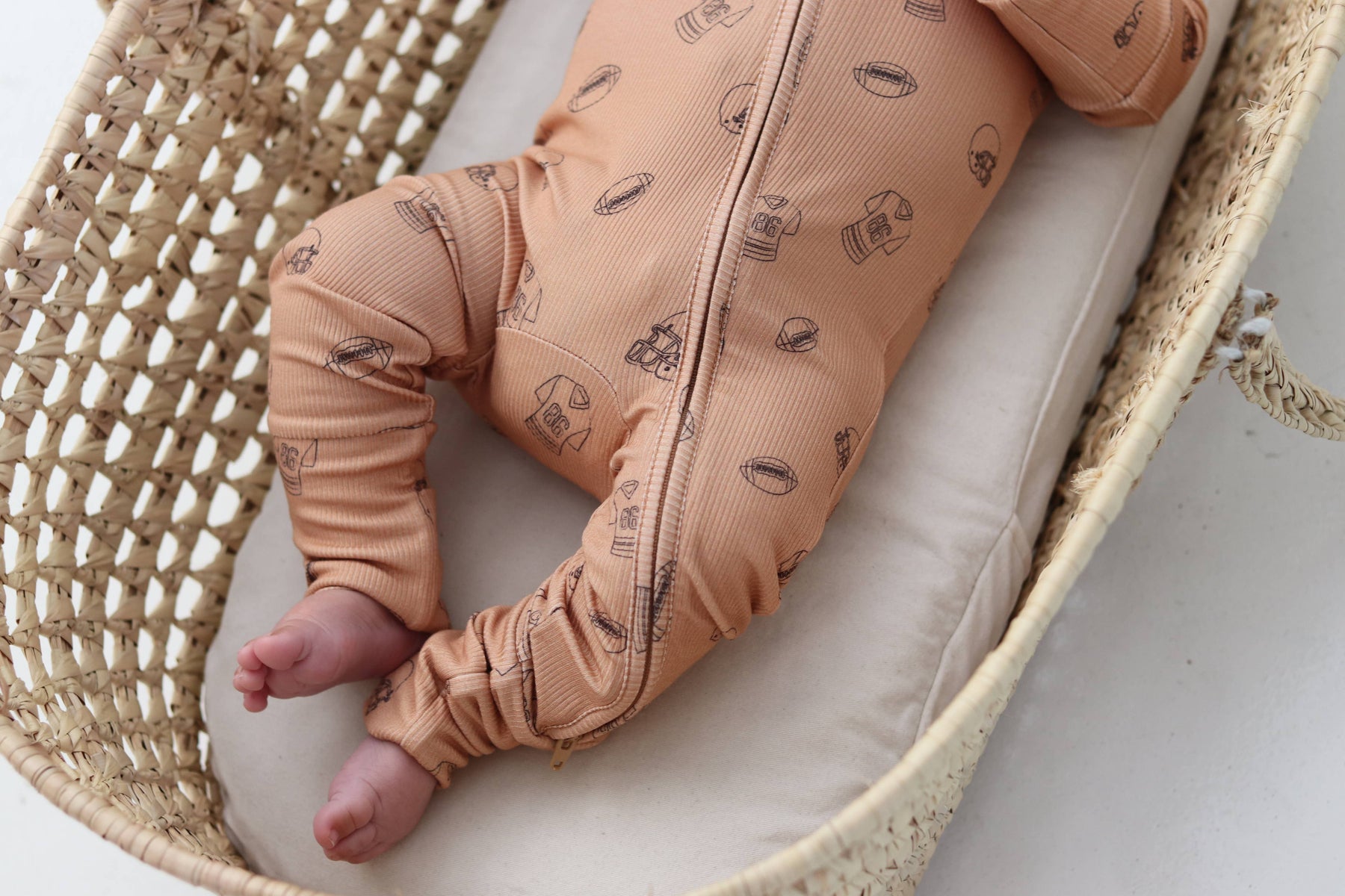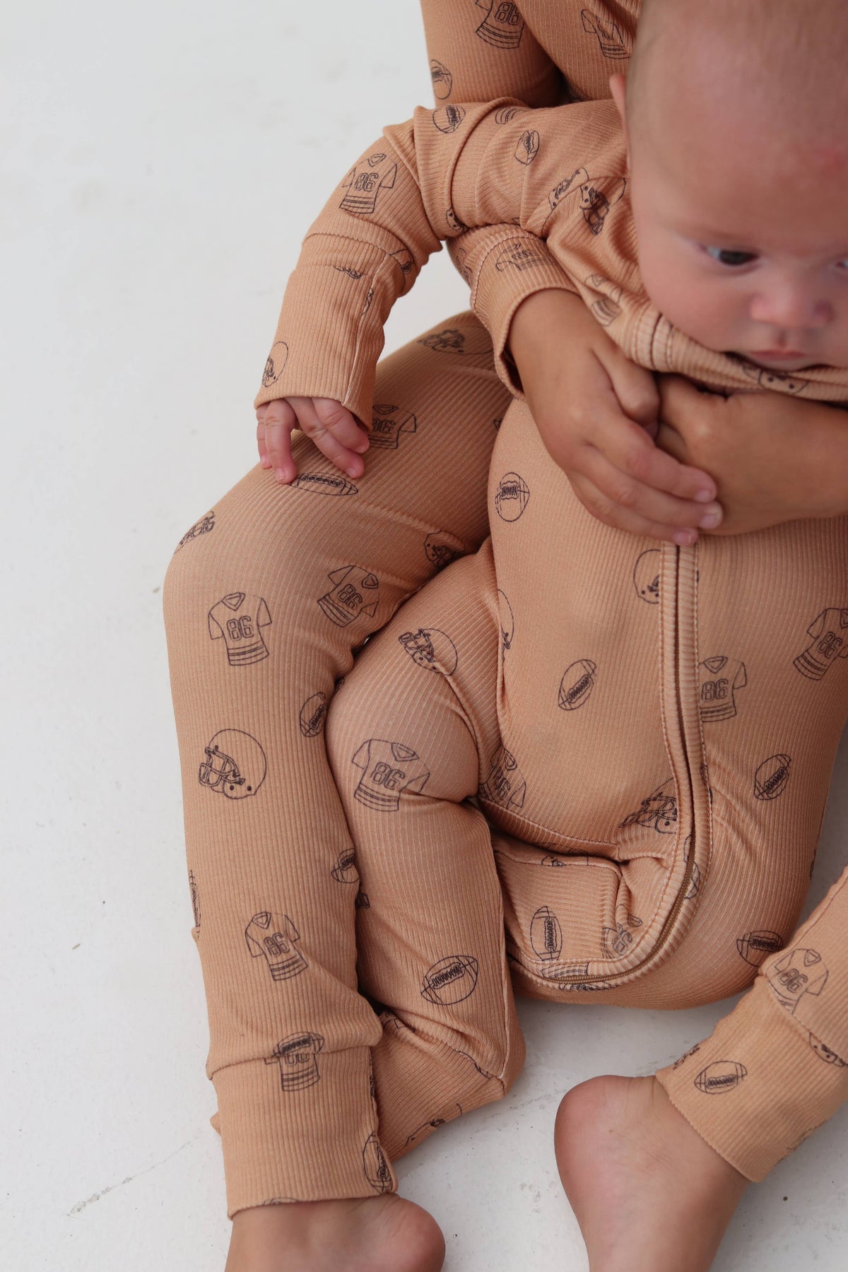 Our Little Linebacker is a minimalist style football print with hand-sketched details, set against a warm camel ribbed background. Perfect for little athletes and football fans, this print is a win for both kids and parents! We chose to create bamboo pajamas because they are our favorite thing to dress our babies in! They are temperature regulating, incredibly soft, comfy, and cute enough for your kiddos to wear out and about. They also have a two-way zipper for easy diaper changes, fold-over hands and fold-over feet. -95% Viscose from Bamboo, 5% Spandex -Bamboo is not chemically treated