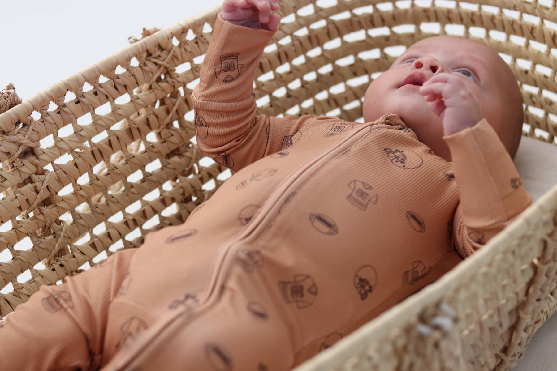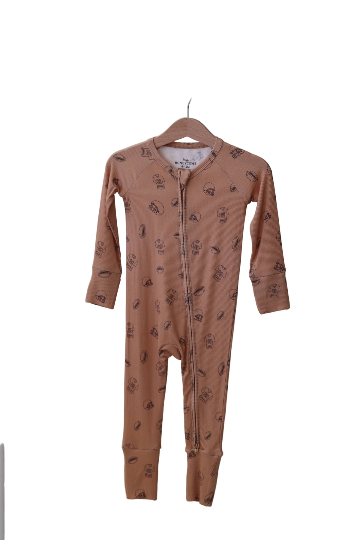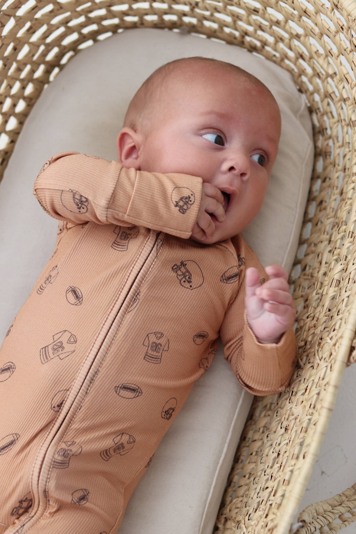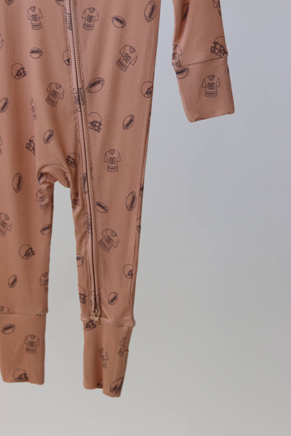 Our Little Linebacker is a minimalist style football print with hand-sketched details, set against a warm camel ribbed background. Perfect for little athletes and football fans, this print is a win for both kids and parents! We chose to create bamboo pajamas because they are our favorite thing to dress our babies in! They are temperature regulating, incredibly soft, comfy, and cute enough for your kiddos to wear out and about. They also have a two-way zipper for easy diaper changes, fold-over hands and fold-over feet. -95% Viscose from Bamboo, 5% Spandex -Bamboo is not chemically treated