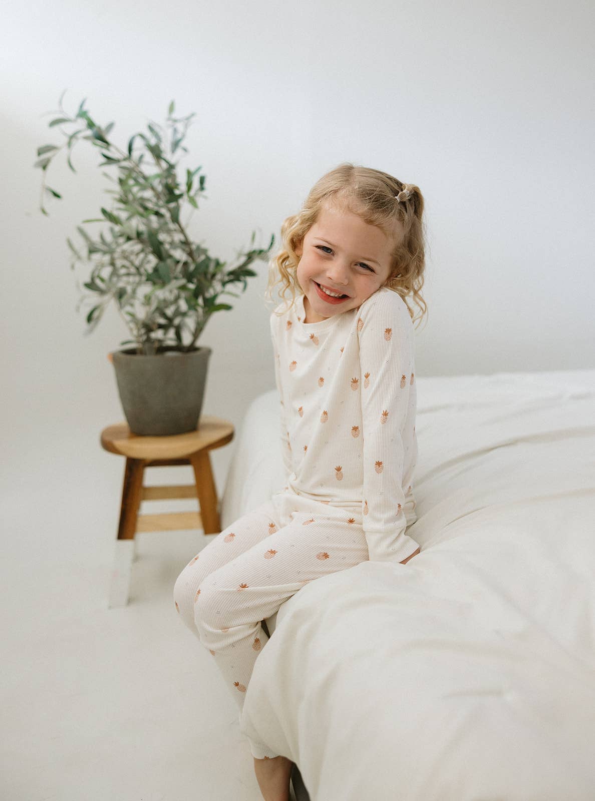 Our sun kissed fruit print has adorable, minimalist, little pink strawberries on a cream ribbed background. We chose to create bamboo pajamas because they are our favorite thing to dress our babies in! They are temperature regulating, incredibly soft, comfy, and cute enough for your kiddos to wear out and about. -95% Viscose from Bamboo, 5% Spandex -Set includes long sleeve top and pants -Bamboo is not chemically treated