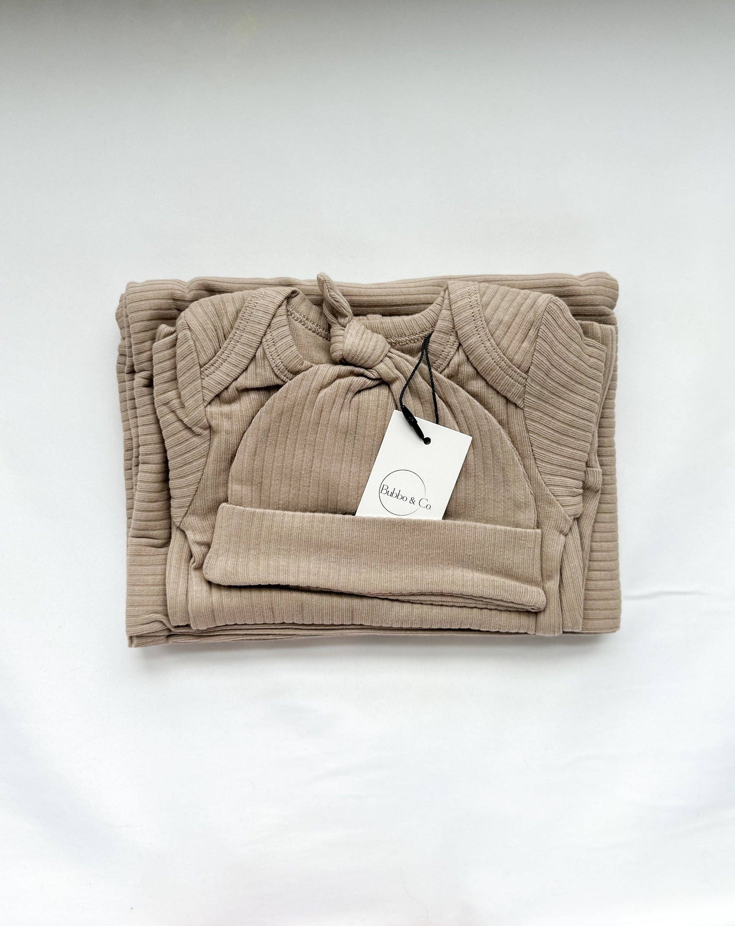 Ready to add to your hospital bag to welcome your little cutie. The set is thought out to ensure comfort for your little newborn when leaving the hospital or even lounging at home. All sets are packed into a reusable soft canvas drawstring bag for ease when packing for your big day. The world outside the womb is cold! This set includes a knotted hat to keep your newborn's head warm, a shirt with built-in cuffs to cover your little one's hands (also prevents them scratching themselves), cuffed pants to ensure feet are warm without worrying about tiny socks falling off and a soft swaddle blanket that can also be used to cover baby's car seat.